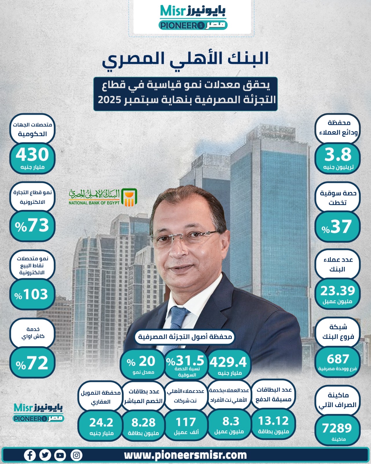 وعلى صعيد نشاط التجزئة المصرفية، ارتفعت محفظة أصول التجزئة المصرفية لتصل الى 429.4 مليار جنيه بحصة سوقية بنسبة 31.50% وبمعدل نمو يصل الى نحو 20 %مقارنة بالعام السابق والتي استهدفت كافة شرائح المواطنين، كما بلغ عدد البطاقات مسبقة الدفع القائمة حاليا بالبنك نحو13.12مليون بطاقة مدفوعة مقدما) منها 12.2 مليون بطاقة ميزة مسبقة الدفع (، إضافة الى نحو 5.17 مليون بطاقة مرتبات، كما ارتفع عدد بطاقات الخصم المباشر لتصل الى 8.28 مليون بطاقة حتى نهاية سبتمبر 2025.