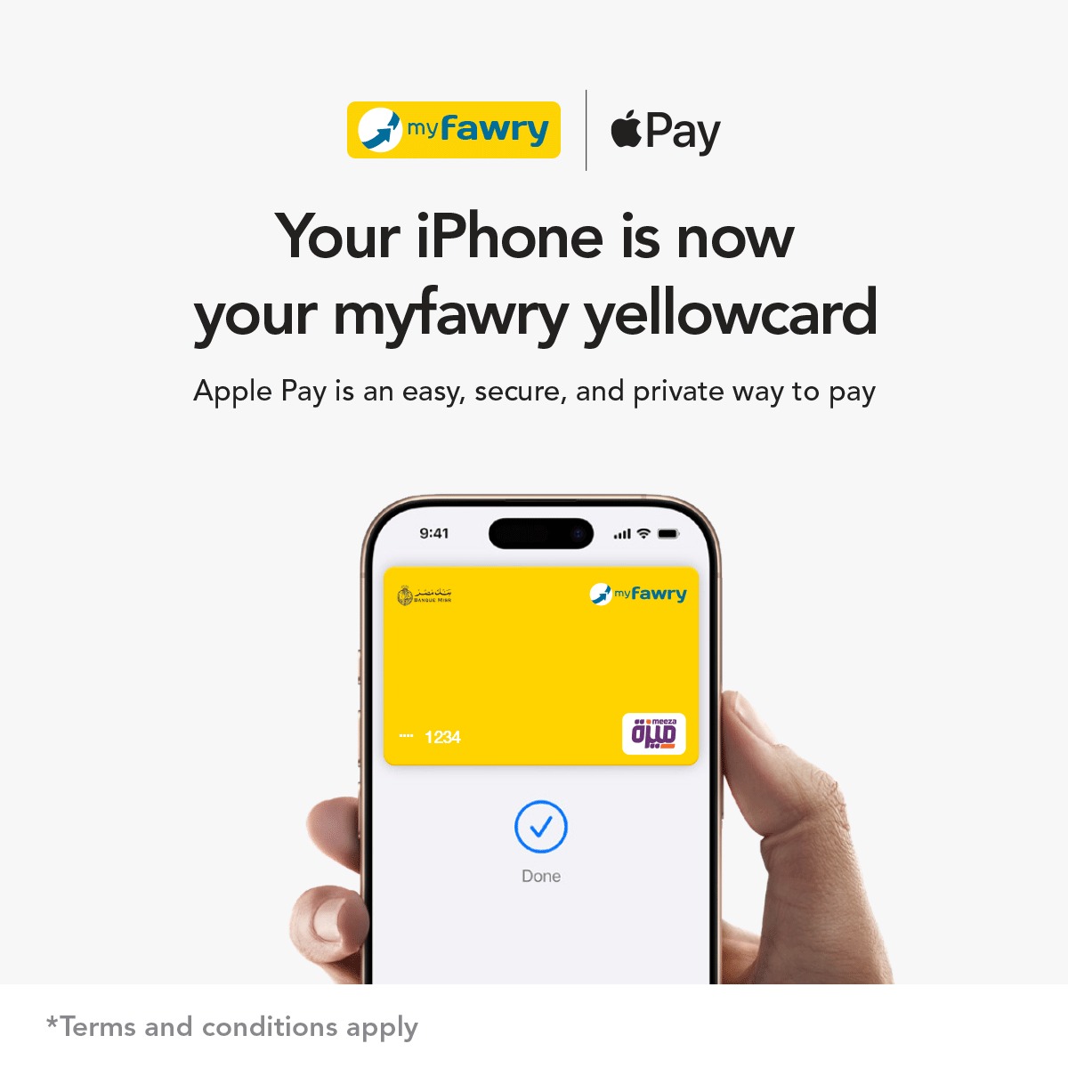 تعد Apple Pay سهلة الإعداد. على iPhone، يمكن ببساطة فتح تطبيق Apple Wallet، والنقر على +، واتباع الخطوات لإضافة بطاقة ماي فوري الصفراء، بمجرد أن يضيف العميل البطاقة إلى iPhone أو Apple Watch أو iPad أو Mac، يمكنه البدء في استخدام Apple Pay على ذلك الجهاز على الفور. سيستمر العملاء في تلقي جميع المكافآت والمزايا التي تقدمها بطاقة ماي فوري الصفراء.