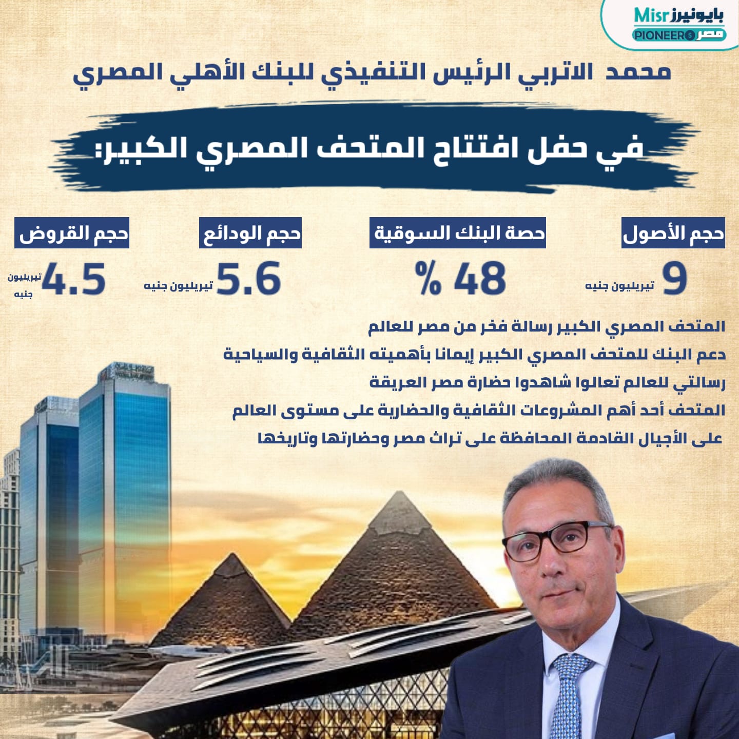 أكد محمد الإتربي، الرئيس التنفيذي للبنك الأهلي المصري، أن البنك الذي يمتد تاريخه لنحو 127 عاماً، يواصل دوره الريادي في دعم الاقتصاد الوطني والحفاظ على الهوية الثقافية المصرية.