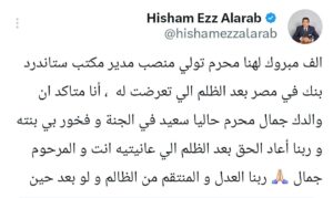 وأشار عز العرب إلى أن هذا التعيين يأتي بعد فترة صعبة مرت بها، مشددًا على أن والدها الراحل جمال محرم سيكون فخورًا بها وبما حققته، داعيًا لها بالتوفيق واسترداد حقوقها.