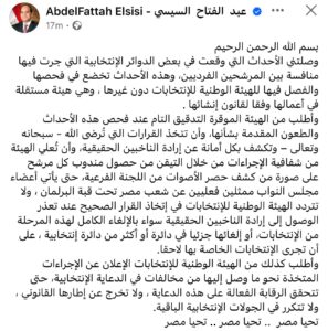 وشدد الرئيس على أن الهيئة الوطنية للانتخابات يجب ألا تتردد في اتخاذ القرار الصحيح إذا تعذر الوصول إلى الإرادة الشعبية الحقيقية، سواء بالإلغاء الكامل لهذه المرحلة من الانتخابات أو الإلغاء الجزئي في دائرة أو أكثر، على أن تُعاد الانتخابات في موعد لاحق.
